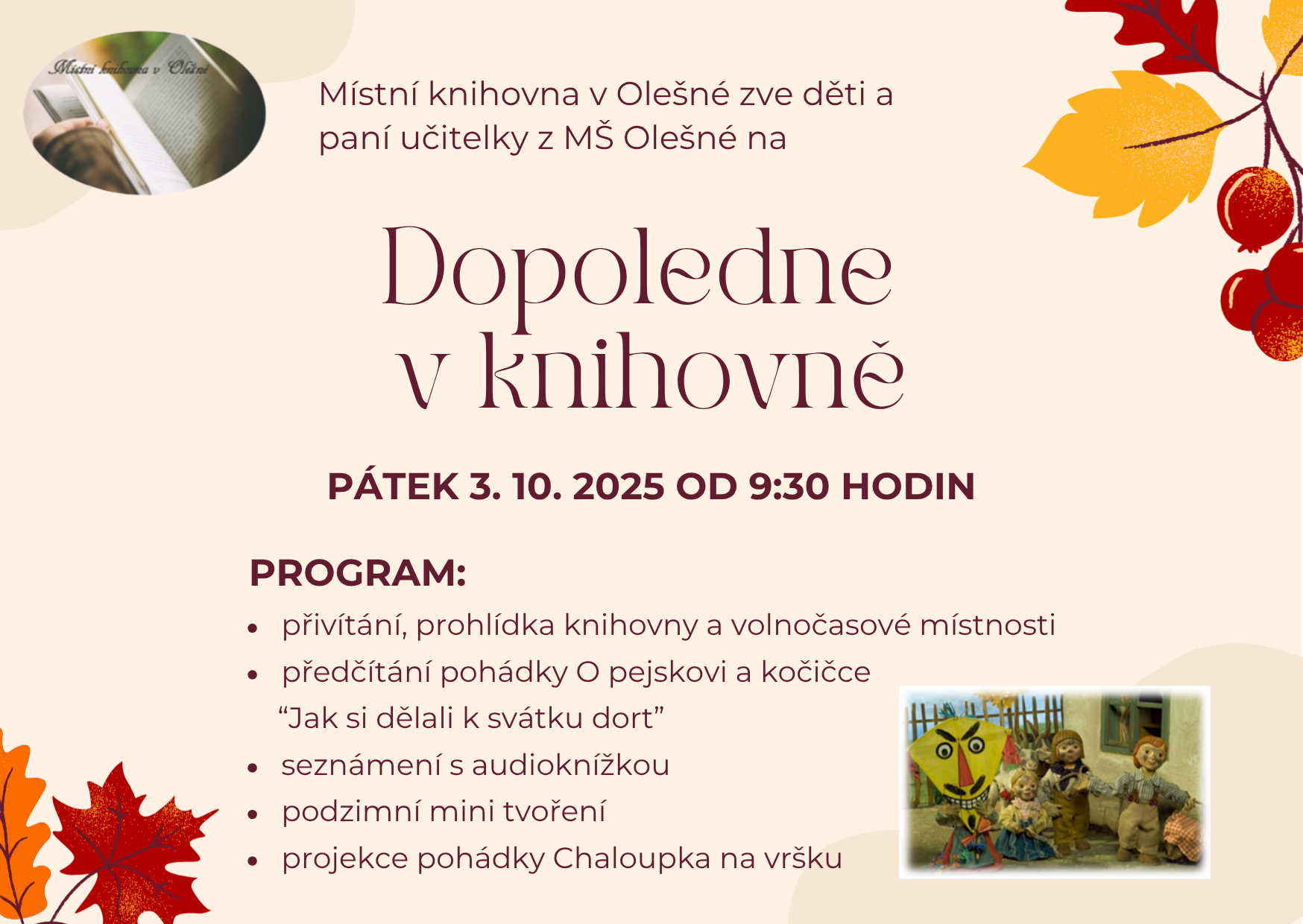 Již tento pátek zavítá do knihovny vzácná návštěva - děti a paní učitelky z MŠ Olešné. Čeká nás rozmanitý program - prohlídka knihovny, čtení oblíbené pohádky od pana Josefa Čapka "Jak si pejsek s kočičkou dělali k svátku dort". Dále nás čeká seznámení s audioknihou a podzimní minitvoření. Dopoledne zakončíme promítáním - tentokrát jsem tematicky zvolila podzimní vyprávění z Chaloupky na vršku. Doufám, že si naše knihovna získá další nové čtenáře! :-)
